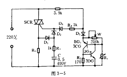 圖3—5用雙晶體管開關(guān)控制“零壓開關(guān)”控溫電路。當(dāng)溫度低于整定值時,熱敏電阻R。較高,BG1,BG2:組成的電子開關(guān)斷開,雙向可控硅SCR在電壓過零附近被觸發(fā)導(dǎo)通,RL,得電加熱升溫。同時電流經(jīng)D1、R1向電容C充電至電源電壓。在負(fù)半周時,電容器C經(jīng)R1,D2、SCR的控制極和RL放電,SCR也被觸發(fā)導(dǎo)通,RL得電加熱升溫。當(dāng)溫度升高到整定值以上時,熱敏電阻較小,BG1、BG2電子開關(guān)開通,SCR控制極被短路,這時正、負(fù)半周電流均不能通過SCR可控硅,RL。無電而停止加熱。如此反復(fù)通斷電流而達到控溫目的。