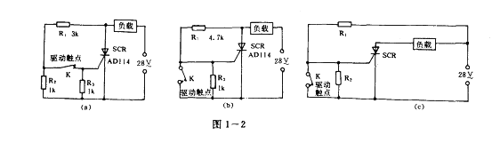 圖1一2所示的電路是用微動(dòng)觸點(diǎn)控制人功率的三種電路,它們是利用小功率來(lái)控制可控硅的控制極開(kāi)通,從而控制較大負(fù)載的功率。