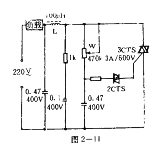 圖2-11電路簡單實用經濟??梢杂米髡{速、調溫等多種用途。該電路的工作原理是常規的阻容移相觸發可控硅,使可控硅的導通角改變以調節負載電流,使相應的負載功能得到調節。調節W即可控制3CTS