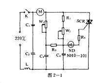 圖2—1所示電路用于電機、電扇等作無級調(diào)速。調(diào)節(jié)W2即可改變SCR雙向可控硅的導(dǎo)通角,以改變輸入電機M的電壓,達(dá)到無級調(diào)速的目的。氖管ND起到觸發(fā)雙向可控硅的作用。這里增設(shè)W1、C3、R3組成的電路,目的是使電機在低速時轉(zhuǎn)動平穩(wěn).W1是電機低速調(diào)節(jié)器。C1、C2及電感器L是抗干擾電路。