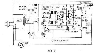 圖3—3采用過零觸發可控硅的控溫電路。它對電源干擾很小。ICl、BG及T2組成過零觸發電路。整流后的脈動電流輸入ICl反相輸入端,在電流過零時ICl輸出一個電脈沖到BG的基極。這時BG飽和導通,其余時間BG截止。在T2次級產生一個脈沖觸發雙向可控硅導通。IC2、R6、R7、W、R1;組成溫度控制電路。被控溫度低于設定溫度時,IC2輸出高電平,D6反偏截止,不影響觸發電路。當溫度升高使IC2輸出低電平時,D6導通。待電源過零后,由于t2時刻脈沖被D6短路,SCR